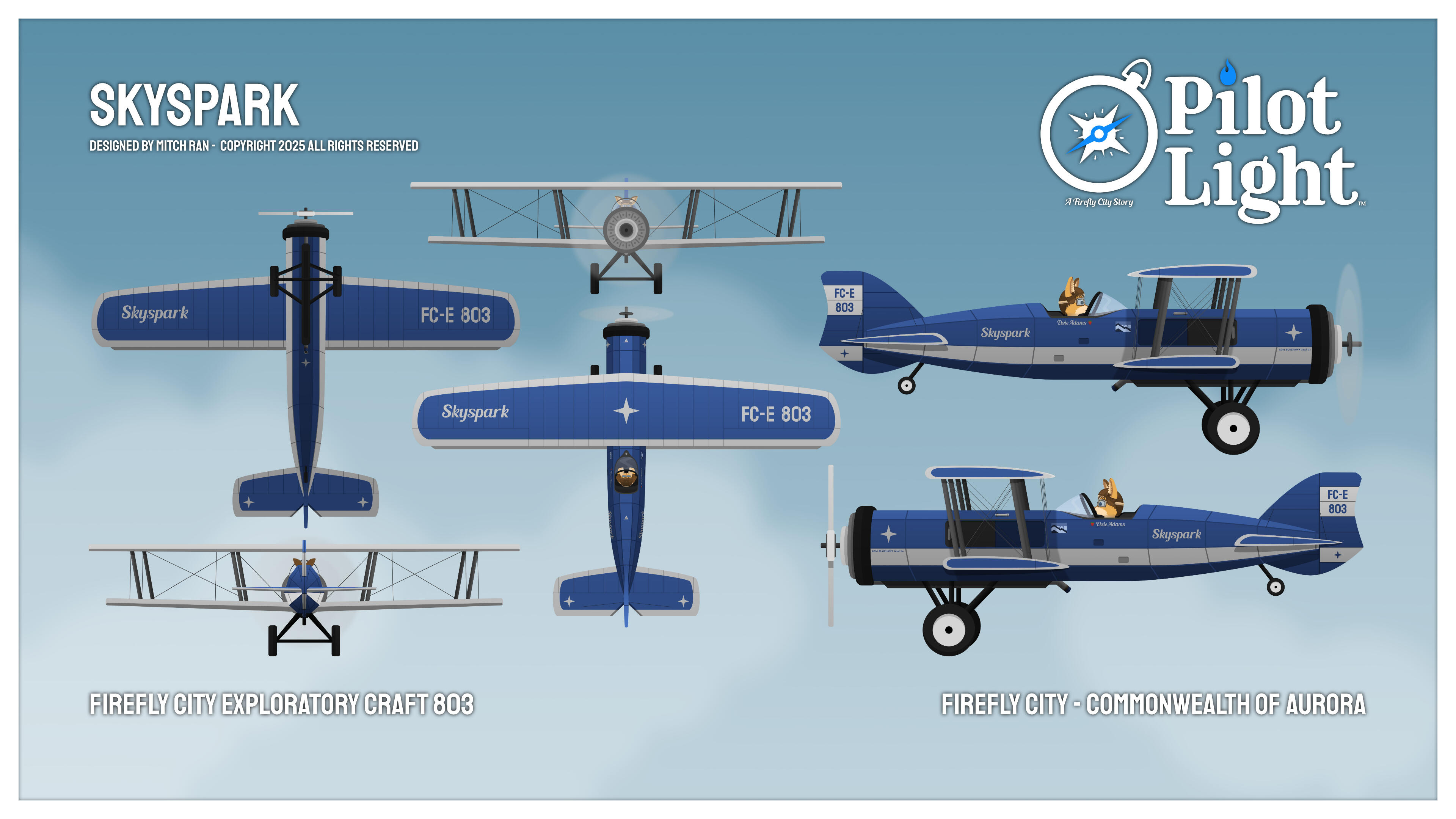 Skyspark was Elsie Adams’ first owned airplane that she learned to fly in as a crop dusting pilot. She eventually took ownership of it and began to use it for barnstorming and exploration, making a name for herself along the way.• Callsign: Skyspark FC-E 803 (Firefly City Exploratory Airplane 803).