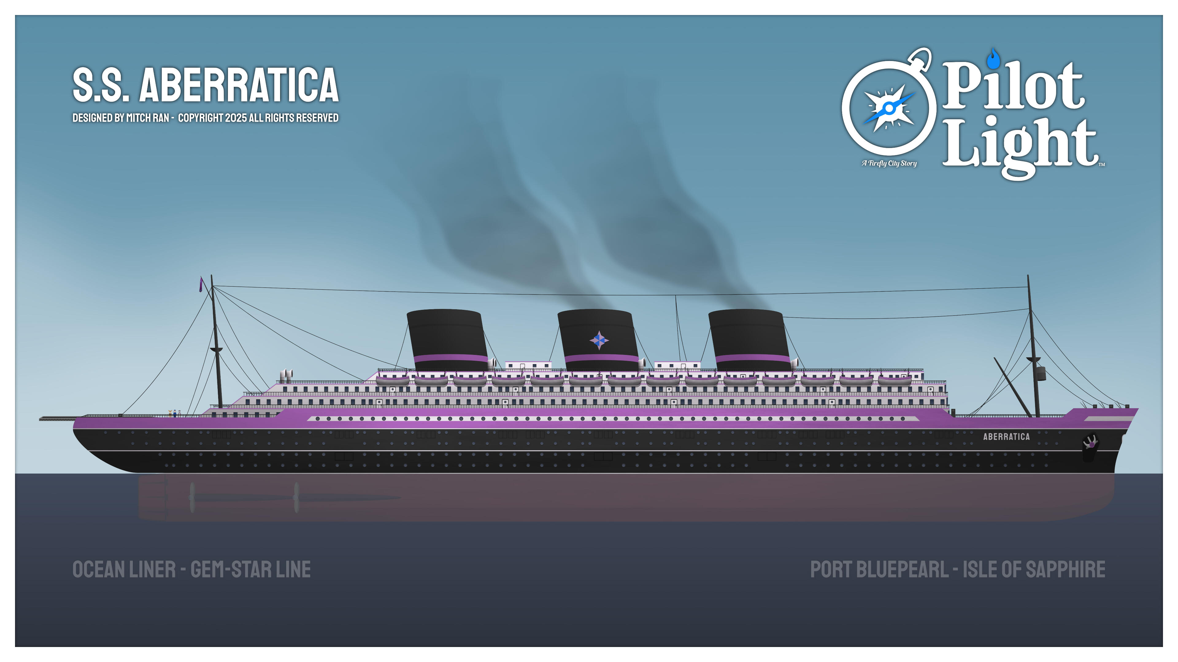 The S.S. Aberratica was a luxurious ocean liner that primarily served a route across the Sea of Shadows between the ports of Firefly City, Midshadow, and Bluepearl (see map above). Jessie served onboard as a stewardess along with several coworkers such as Tabitha, Sidney, and Chief Steward Victor Candin. The ship itself was involved in numerous experiments and technological tests, some of which were more risky than others.• Company: Gem-Star Line.