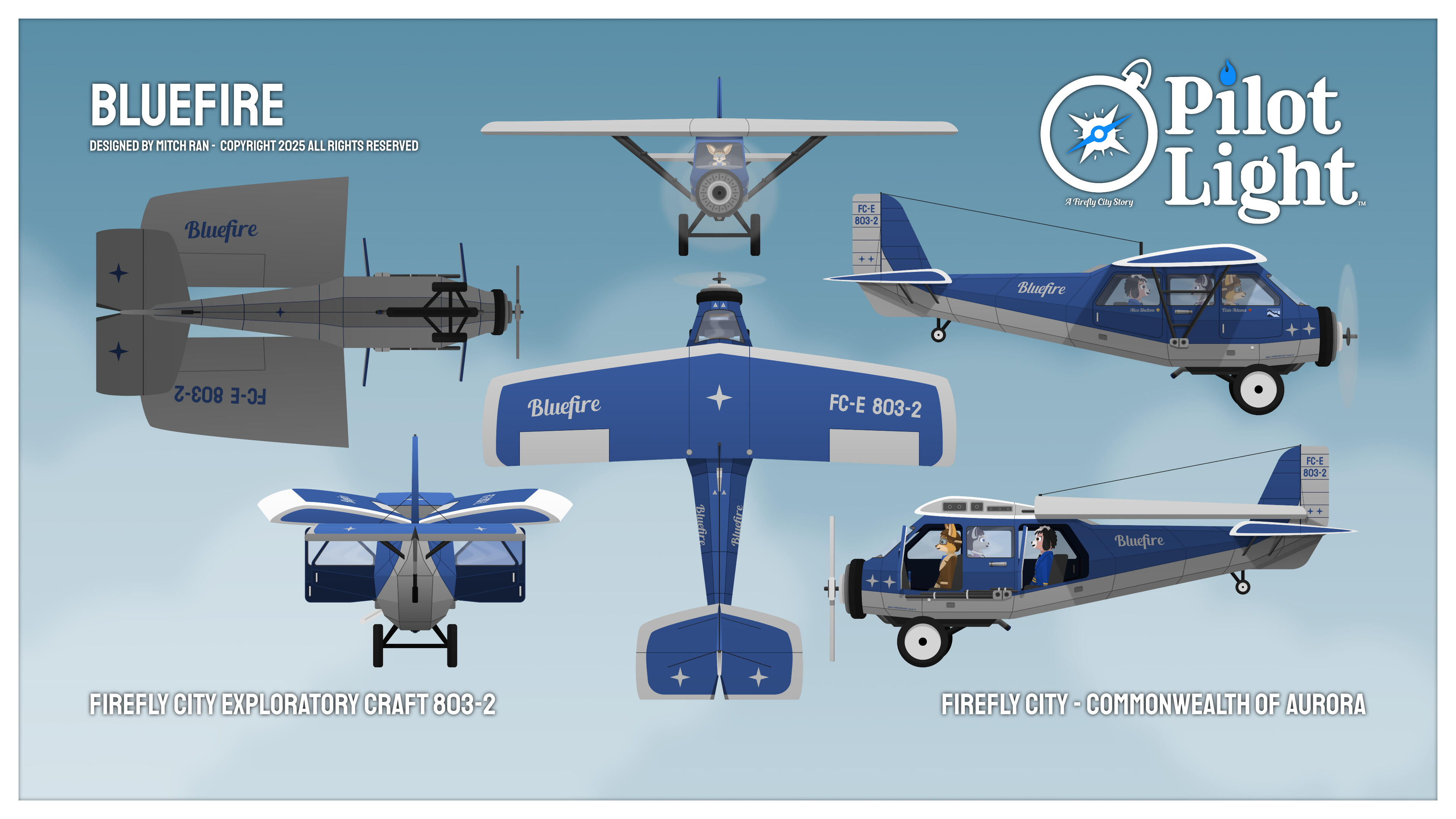 Bluefire was Elsie Adams’ second owned aircraft that she acquired through a lease buyout while working with Alice. This was the primary aircraft that they used in their adventures together, eventually adding a third seat for Jessie as well as other, more experimental modifications.• Callsign: Bluefire FC-E 803-2 (Firefly City Exploratory Airplane 803-2).